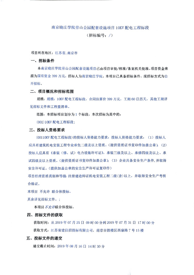 南京晓庄学院劳山公园配套设施项目10KV配电工程标段