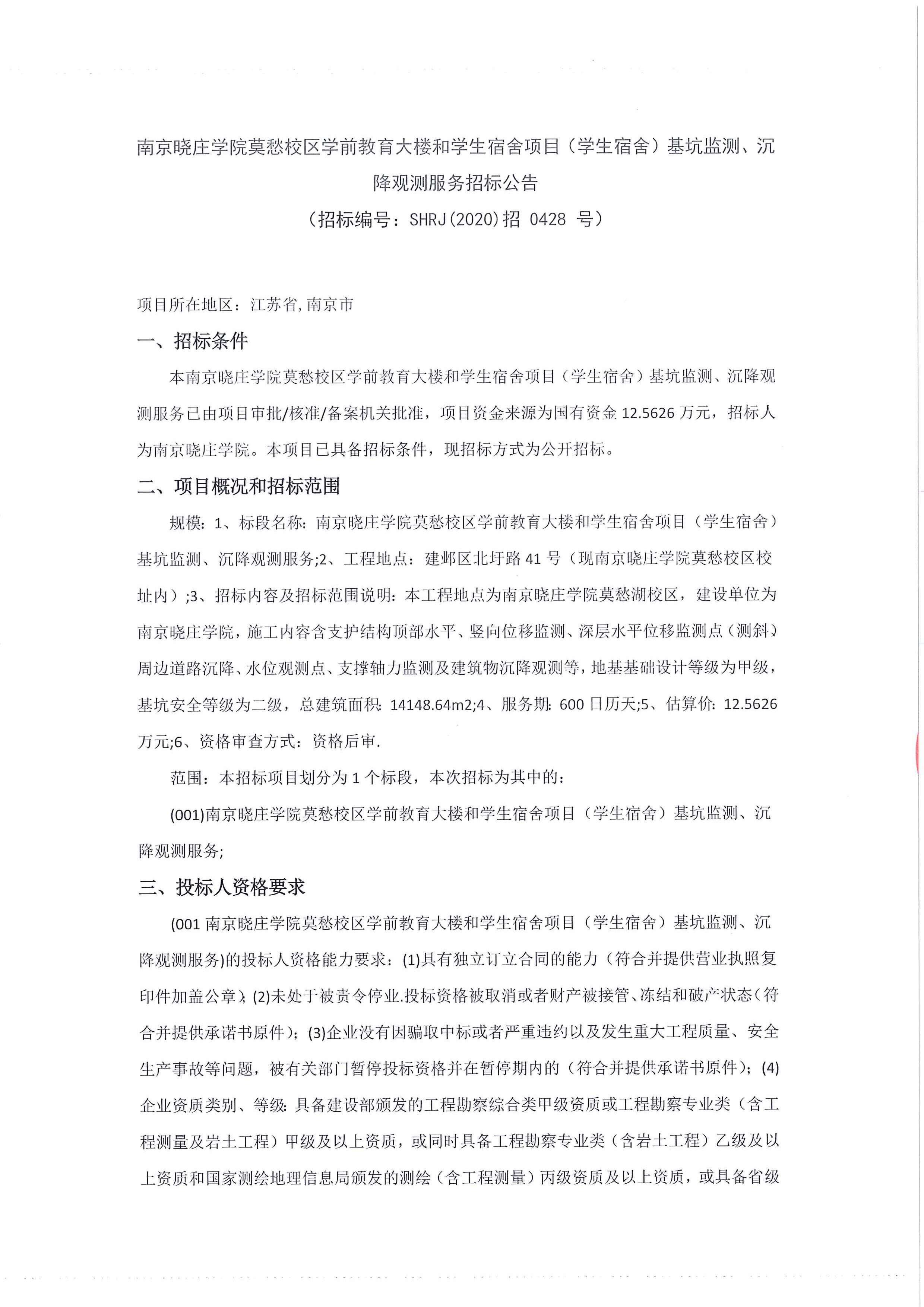 南京晓庄学院莫愁校区学前教育大楼和学生宿舍项目(学生宿舍)基坑监测、沉降观测服务招标公告