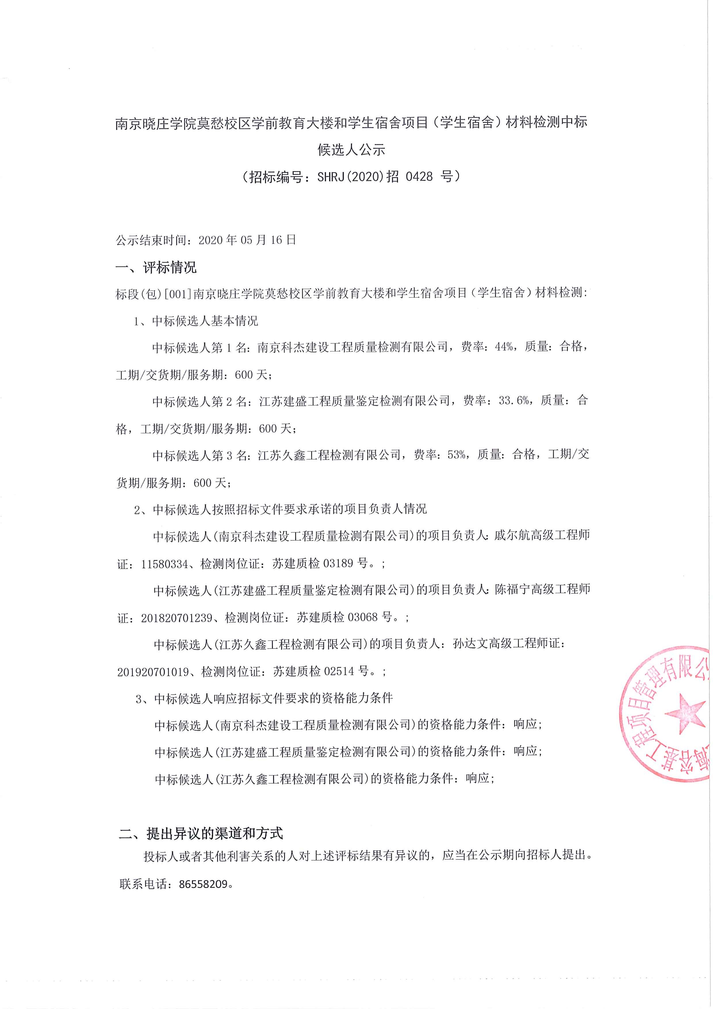 南京晓庄学院莫愁校区学前教育大楼和学生宿舍项目(学生宿舍)材料检测中标候选人公示