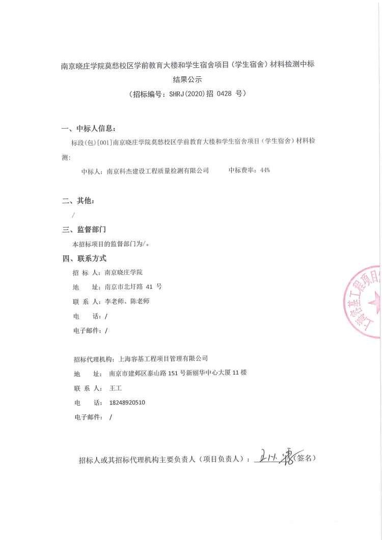 南京晓庄学院莫愁校区学前教育大楼和学生宿舍项目(学生宿舍)材料检测中标结果公示